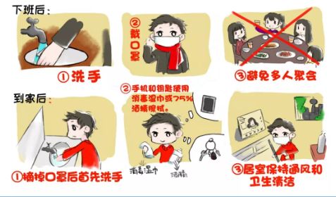 洗手后佩戴一次性醫用口罩外出,回到家中摘掉口罩后首先洗手消毒。手機和鑰匙使用消毒濕巾或75%酒精擦拭。居室保持通風和衛生清潔,避免多人聚會。
