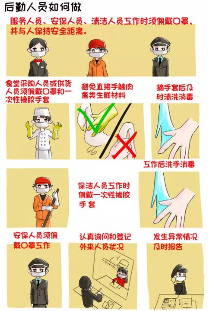 服務人員、安保人員、清潔人員工作時須佩戴口罩,并與人保持安全距離。食堂采購人員或供貨人員須佩戴口罩和一次性橡膠手套,避免直接手觸肉禽類生鮮材料,摘手套后及時洗手消毒。保潔人員工作時須佩戴一次性橡膠手套,工作結束后洗手消毒。安保人員須佩戴口罩工作,并認真詢問和登記外來人員狀況,發現異常情況及時報告。