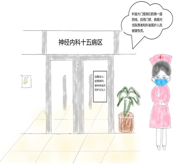 在疫情防控期間,科室日常的戰疫工作尤為重要,從“第一道防線”大門的守候到住院患者的日常宣教,每一步工作都有護士辛勤的付出。勝利在望,我們仍需繼續堅持,做好科室的日常防控工作,保障科室住院患者以及醫護人員的安全,是我們義不容辭的責任,同時也向奉獻在第一線的白衣天使們,致以崇高的敬意!下面簡單介紹一下我科的防疫措施: