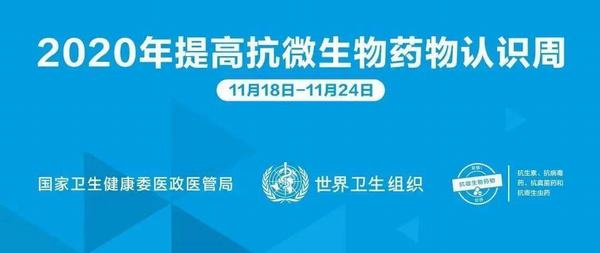 2020年5月,世界衛生組織、聯合國糧食及農業組織和世界動物衛生組織召開會議,決定將“抗菌藥物”名稱改為 “抗微生物藥物”,將每年11月的第三周定為“世界提高抗微生物藥物認識周”。為提高全社會合理使用抗微生物藥物的意識和水平,國家衛生健康委醫政醫管局在11月18日-24日組織開展“2020年提高抗微生物藥物認識周”活動,今年的主題是“團結起來保護抗微生物藥物”。