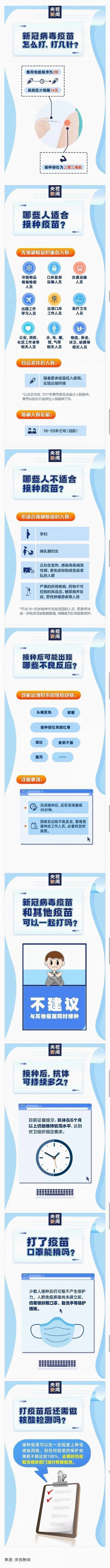 近日,我國(guó)首批新冠病毒疫苗開(kāi)始對(duì)重點(diǎn)人群進(jìn)行接種。疫苗需要打幾針?適用于哪些人群?打完后能不能摘口罩?出現(xiàn)不良反應(yīng)怎么辦?今天,通過(guò)一組圖,一起了解↓↓↓