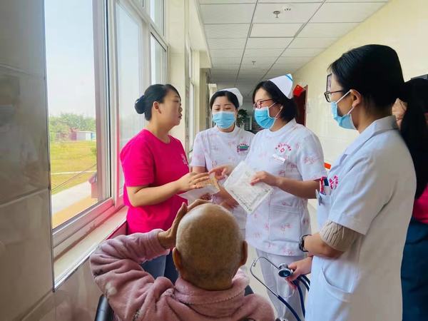 我院王長寧總護士長及路娟醫師帶領一行人員實地走進老人們的房間進行查房、查體,為傷殘老人進行日常用藥與康復功能鍛煉指導,并發放隨身攜帶的健康教育宣傳冊。