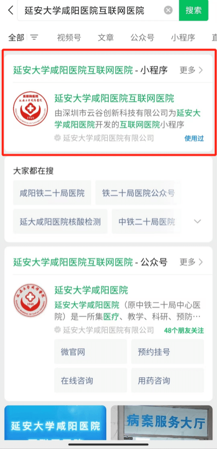 微信搜索延安大學咸陽醫(yī)院互聯(lián)醫(yī)院,點擊即可進入