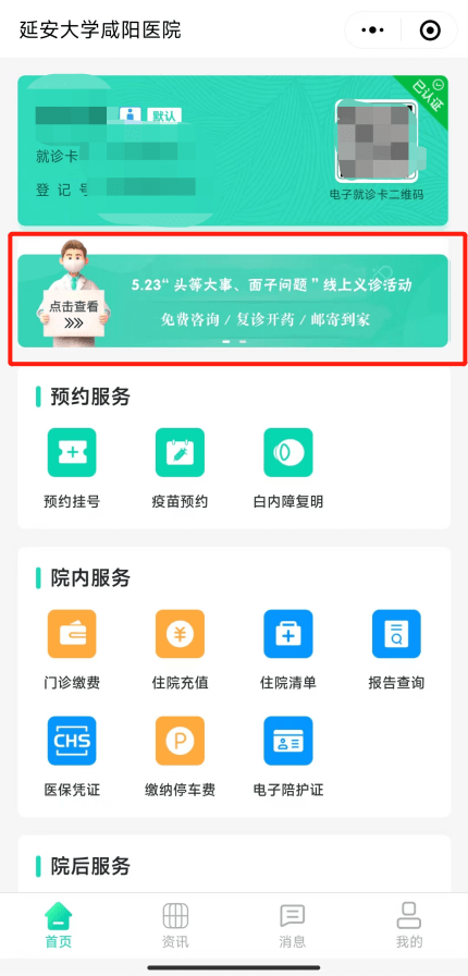 微信識別下方二維碼,即可識別進入“延安大學咸陽醫(yī)院互聯(lián)網(wǎng)醫(yī)院”小程序,注冊后進入義診專區(qū)。
