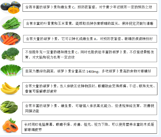 給予富含維生素A和視黃醇、花青素,葉黃素的食物 ;多吃水果、蔬菜和富含維生素的食物,控制甜食、飲料的攝入。