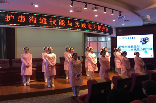 首先由徐院長做開班致辭,講到“不學禮無以立,人無禮則不生,事無禮則不成,國無禮則不寧。”學習溝通技能,一是有助于提高醫護人員自身修養,二是有助于改善醫患間人際關系,也是我們維護健康醫患關系的臂膀。開班儀式中,由我院護士服務規范專業組人員展示護士標準化禮儀,從站姿、蹲姿、坐姿、點頭禮、鞠躬禮、開關門禮儀、近距離提示、原地指路、伴隨引路等方面用肢體語言,詮釋我院護理服務文化內涵,展現我院護理人員的修養與氣質。
