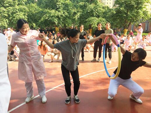 本次團建項目大多為趣味運動,來自各臨床科室的護士及我院駐院護理見習生共一百余人參加。活動分為“團體項目”和個人項目,跳大繩、呼啦圈過山車及摸石頭過河等團體項目首先進行,隨后進行了趣味性較強的個人項目——臀抖乒乓球和瞎子敲鑼。各位選手摩拳擦掌,精神抖擻,躍躍欲試。看這邊“眾志成城,萬眾一心”集體跳大繩比賽,隨著啦啦隊的助威聲,選手們就像雀躍的小鳥一樣歡騰跳躍著;再看那邊“呼啦圈過山車接力比賽” 齊心協(xié)力力量大,吶喊聲、加油聲、歡呼聲將現(xiàn)場的氣氛推入了高潮。杏林廣場變成了熱情的海洋,歡笑的中心。白衣天使們一改往日嚴謹、細致、溫柔的形象,在運動場上盡情揮灑汗水,賽出了成績、賽出了風采,你追我趕,盡情享受趣味運動帶來的快樂。