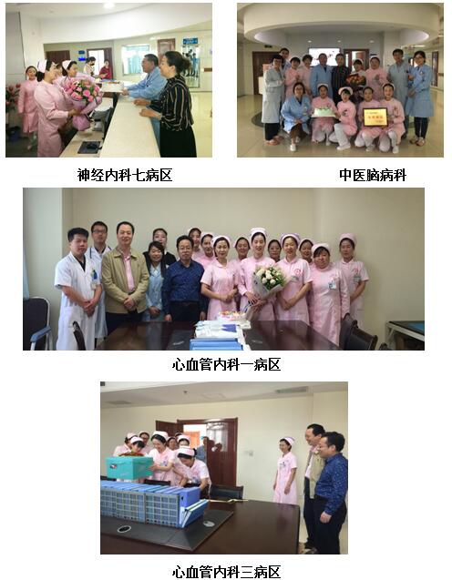 在臨床科室晨交班匯報時、床頭交接班時、工作進行中,延安大學咸陽醫院康彥文院長、張海濤常務副院長、徐京華副院長、工會亓梅主席、科研教學管理中心韓曉芳主任;腦血管病院慕廷民院長、心血管病院吳棟梁院長、內科病院王丙聚院長帶領護理部楊敏主任、陳英總護士長、王長寧總護士長、黨文婷總護士長、宋春蘭總護士長分成四組攜帶精美的大蛋糕、芬芳的鮮花已經意外的出現我院2018-2019年度優質護理服務病區的護理人員面前。