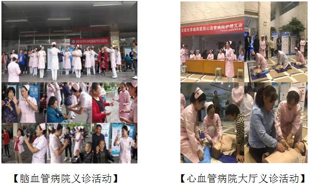 隨后,各分院在總護士長的帶領下于各分院門診大廳進行了專項義診活動。各專業委員會積極組織,認真籌備,根據醫院實際情況準備所需材料,展板、器材或演示模具等,通過發放資料、現場教授、咨詢、健康教育、模擬演練等多種形式為群眾傳播健康知識。在各義診點,經驗豐富的醫務工作者們,為患者及家屬測量血壓,根據其提出的具體問題給予耐心細致的解答并根據個體差異提出了合理的健康指導以及相關注意事項。期間,急診科、心臟科的護士分別為現場的患者及家屬分別演示了單、雙人心肺復蘇術,旨在提高全民在突發事件中的自救互救技能。接下來,呼吸內科、腫瘤胸外科、疼痛科、骨科、神經內科分別演示了呼吸操、護頸操、健腦操、施氏十二字養生功,以實際行動普及健康知識。
