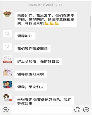 面對日漸增多的病例,身為醫務人員的我們自然責無旁貸。1月23日,科室接到醫院號召護理人員援鄂抗擊疫情的通知,所有兄弟姐妹們紛紛踴躍報名,得到的都是護士長諸如“你很棒,等待通知”“好,第二梯隊準備”之類的回復,那時候我們懵懂,心底十足的使命感使我們熱血沸騰。之后的三天風平浪靜,沒有接到任何通知,似乎一切都沒有發生過。直到1月26日,護士長在群里的一段話讓我們炸開了鍋:“親愛的們,我出發了,你們在家乖乖的,做好防護,仔細排查探視家屬,等我回來”。這時我們才知道,為什么報名后遲遲沒有動靜,在這國家危難時候,護士長她心里只揣著一名護士的職責,她“拋下”了為人子女、為人妻、為人母的責任,把我們擋在后方,而把自己推到了最前線,把直面疫情的重任和未知的危險統統擔在了自己的肩上。