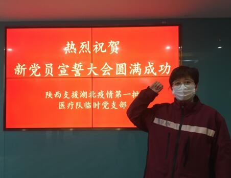 大事難事看擔當,危難時刻,來之能戰顯本色,陜西省第一批援鄂醫療隊黨支部的成立,讓黨旗在一線高高飄揚,加入中國共產黨一直是我的夢想,在武漢,我圓夢了。2020年3月16日,我參加了預備黨員集體宣誓儀式,成為了中國共產黨預備黨員。那一刻,我倍感自豪。