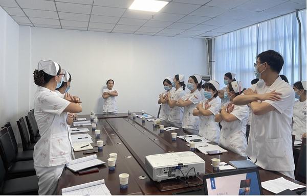 查體匯報結束后,大家就患者現存及潛在的護理問題和解決問題的方法進行了積極的探討與交流。圍繞患者失眠、多夢以及夜間咳嗽展開討論。精神科薛娜護士長通過對夢的解說使大家認識到夢是情緒的宣泄,是患者潛意識的表現,在護理過程中需關注患者的性格特點及日常生活習慣,以及心理治療對失眠的重要性,并現場互動學習了“樂眠操”。