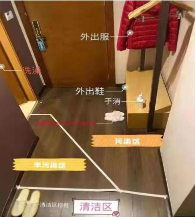 結束一天的任務返回駐地,感控組的組員們會隨時抽查駐地感染管理措施的落實情況,要求每一個隊員嚴格執(zhí)行進出房間的每一步流程。為了隊員們執(zhí)行方便,感控組每兩天就會將房間區(qū)域標識圖發(fā)在工作群,以確保駐地管理制度落地。