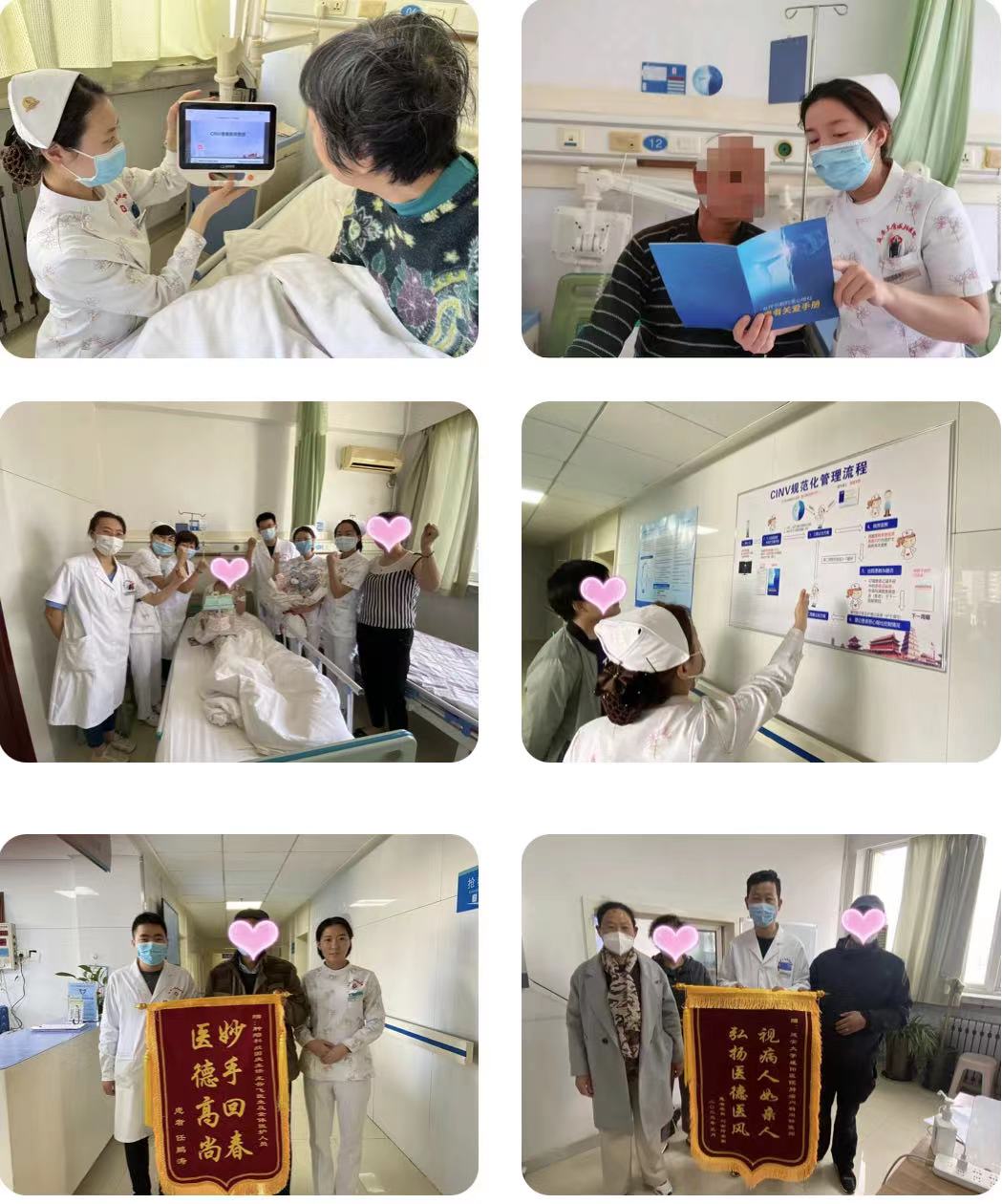 在深入開展“無痛、安寧療護”病房工作的基礎上,積極推進“陜西省CINV規范化治療示范病房”創建工作,根據CINV規范化管理流程,著力打造“無嘔病房”。為確保“無嘔病房”工作順利開展,科室對全員進行培訓上崗,成立CINV小組,建立健全首診問診制度,明確醫生、護士職責,每位醫護人員掌握相關知識,了解惡心、嘔吐( CINV )治療的重要性。掌握CINV評估方法,制定患者化療方案,評估患者致吐風險及預期性嘔吐,根據CINV致吐風險評估結果為患者制定個體化的止吐方案。自患者入院開始,護士就通過“化療患者關愛手冊”床頭平板視頻播放等多渠道,從飲食、藥物、心理等多方面進行宣教,降低患者惡心、嘔吐發生率。定期開展患者健康教育、社會支持以及患者之間的分享交流座談會,由醫護為患者進行正確指導,解決患者疑惑,患友們之間分享自己化療期惡心、嘔吐經驗及自己覺得更好應對措施。出院患者我們做好一對一隨訪工作及滿意度調查,記錄嘔吐的頻次、持續時間。持續提高患者滿意度及生存質量,彰顯對化療患者的人文關懷。于2023年4月15日獲首批“陜西省CINV規范化治療示范病房”授牌。科室連續五年未收到有責護理投訴,多次收到患者及家屬的錦旗及表揚信。