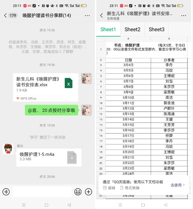 "腹有詩書氣自華,最是書香能致遠”,讀書可以明理、啟智、養德。為積極響應護理服務行動計劃,進一步根深人文護理理念,提高護理隊伍人文素養,細化人文關懷措施,為患者提供人性化護理服務。兒科二病區護士長盧群葉組織大家開展“同讀書,共進步”活動。大家集思廣益制定了共讀方案及讀書實施表,護士每天輪流閱讀,于當日20:00以錄音文件形式發至微信群內,大家利用碎片化時間接龍分享聽書心得。