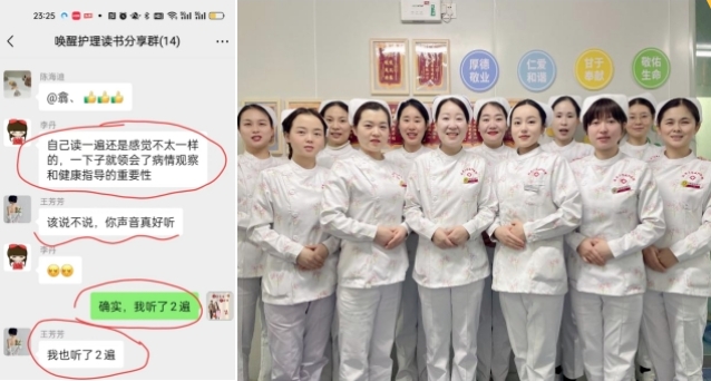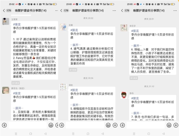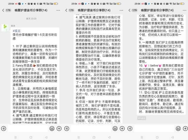 第一天讀書分享后,我主動帶頭將聽書后感想發至群內,護士姐妹們熱情高漲,讀書聽書積極性很高,分別接龍分享了自己聽書后的感想,丹丹護士表達“自己讀一遍還是感覺不太一樣的,一下子就領會了病情觀察和健康指導的重要性”。芳芳護士分享“我們都是經過專業化培訓的護士,不僅僅是打針、發藥、測量生命體征,及時觀察患者的病情變化至關重要,并給患者講述最專業最權威的相關疾病的健康教育......”大家分別分享著自己的心得體會,沉浸在讀書的氛圍中……