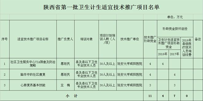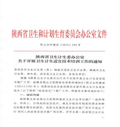 2016年12月5日,根據《陜西省衛生計生委辦公室關于開展衛生計生適宜技術培訓工作的通知》(陜衛辦科教發【2016】200號)文件精神,我院慕廷民副院長領銜申報的項目《社區衛生服務中心TIA篩查及防治策略》、《腦卒中的社區康復》和心血管內科二病區左梅主任領銜申報的項目《心肺復蘇基本技能》經陜西省衛計委審核評定,分別獲批為陜西省第一批衛生計生適宜技術推廣項目,獲批經費總計達11萬。本次全省共選出42個項目列入陜西省適宜技術推廣項目庫。