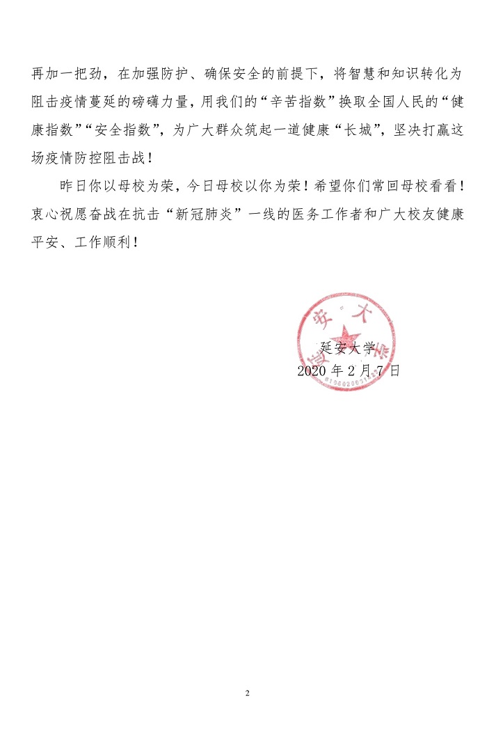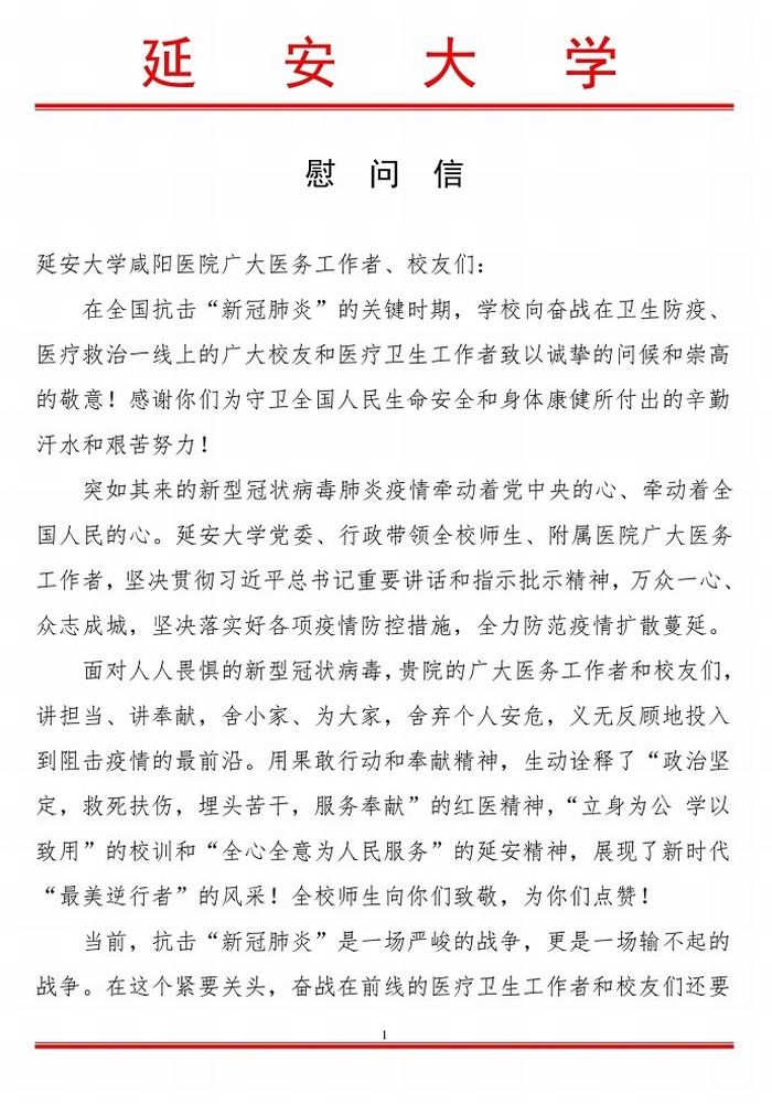 延安大學致延安大學咸陽醫院廣大醫務工作者、校友慰問信