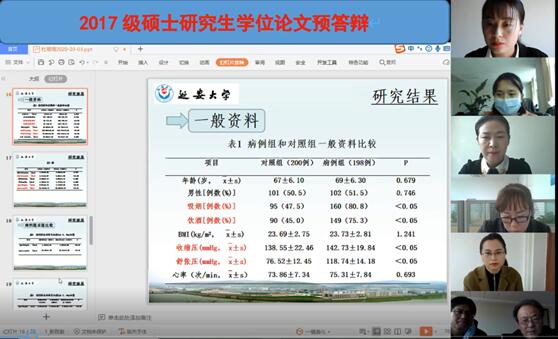 2020年3月3日,延安大學咸陽醫院2017級碩士學位論文線上預答辯順利舉行。我院牛小麟名譽院長、科研教學管理中心韓曉芳主任、王丙聚副院長、趙雄飛副院長、陳萍博士、廉秋芳博士、左梅教授、郭愛紅教授參加此次線上預答辯。預答辯由韓曉芳主任主持,2017級碩士研究生進行了線上預答辯。