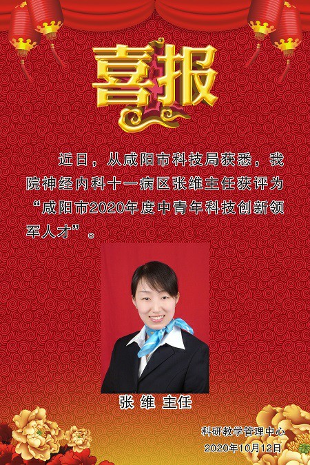 近日,從咸陽市科技局獲悉,我院神經內科十一病區張維主任榮膺“咸陽市2020年度中青年科技創新領軍人才” 稱號!