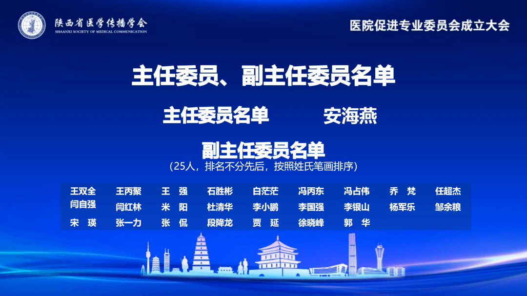 陜西省醫學傳播學會醫院促進專業委員會由安海燕(原陜西省衛生健康委員會醫政醫管局局長)和鄒余糧(西安交通大學第一附屬醫院東院區執行院長)等省內權威專家學者發起,聚焦新醫改形勢下的現代醫院管理制度、智慧醫院優質服務和精細化運營管理等內容,圍繞醫院績效考核、國家醫學中心建設、醫院等級評審、深化醫保支付方式改革和學科建設等主題,通過解讀國家政策、探討管理內涵和分享管理經驗等,促進醫院核心競爭力和區域影響力不斷提升,促進醫院高質量發展,增強患者就醫獲得感、安全感。第一屆專業委員會由229名委員構成,人選來自全省各地市醫療機構醫院管理人員,代表了我省醫學傳播學術研究的最權威力量。