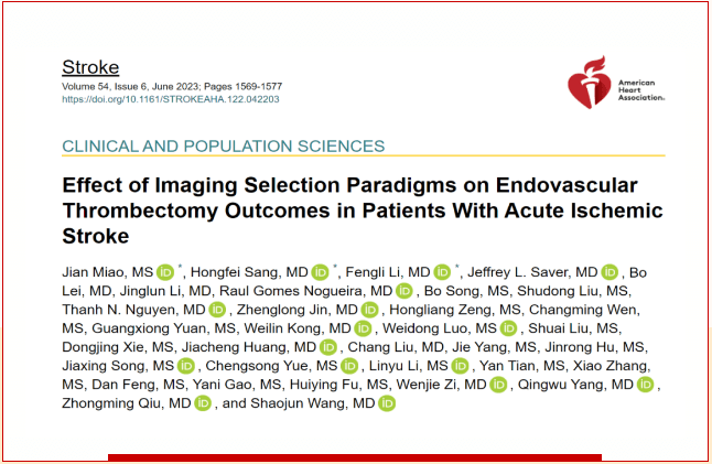 近日,我院神經內科團隊在國際腦卒中領域頂級期刊《Stroke》發表SCI研究論文 “Effect of Imaging Selection Paradigms on Endovascular Thrombectomy Outcomes in Acute Ischemic Stroke Patients with Large Vessel Occlusion”。延安大學2020級神經病學專業碩士研究生苗建為第一作者,老年病科王少君主任、腦病急診科宋波主任為論文指導老師,延安大學咸陽醫院為通訊單位?!禨troke》雜志是美國卒中協會(American Stroke Association)的官方雜志。該期刊影響因子為10.17分,是中科院一區TOP期刊。