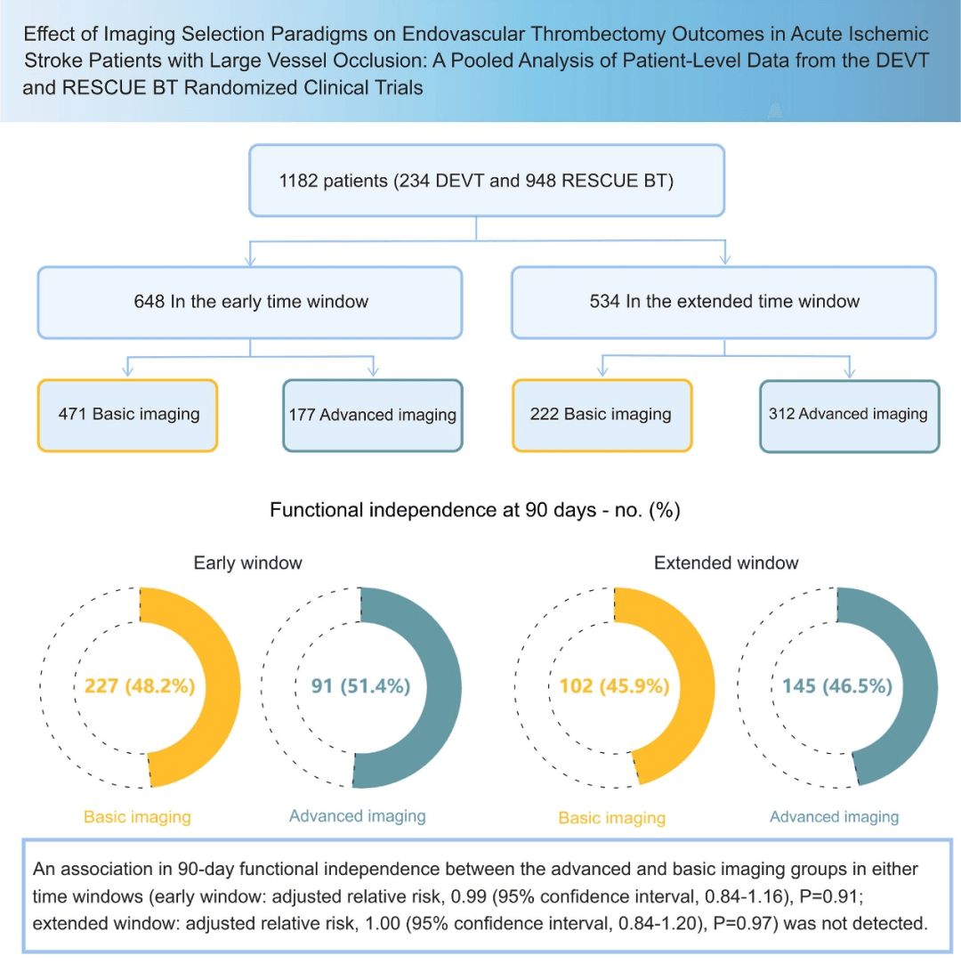 該研究比較基礎影像(平掃CT±CT血管成像)與高級影像(MRI或CTP)篩選模式,對不同時間窗急性大血管閉塞性卒中患者血管內治療預后的影響。探討了僅用基礎影像評估急性大血管閉塞性卒中患者血管內治療資格的可行性,為卒中患者早期血管再通治療提供了更為簡便快捷的篩選策略,同時優化了臨床救治流程,并為在初級卒中中心普及血管內治療方案提供了新思路。