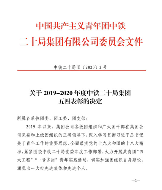 歲月如煙,流年似水。值此中國共產主義青年團九十八周年之際,我院團支部獲得“2019-2020年度中鐵二十局五四紅旗團支部”榮譽稱號;援鄂抗疫勇士張春妮同志獲得“防疫戰役好青年”榮譽稱號;吳迪同志獲得“2019-2020年度中鐵二十局優秀共青團員”榮譽稱號。榮譽不僅是對我院先進集體和優秀個人的肯定,更是對我院一年來團工作的肯定。