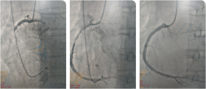 時間就是生命!心內科介入團隊與死神展開較量,大家輪流為患者進行心肺復蘇,并以最快的速度完成消毒、鋪巾。患者大動脈搏動消失,李新國主任、吳利杰主任憑借扎實的基本功,盲穿腋靜脈及右側股動脈,植入臨時起搏器。根據心電圖判斷罪犯血管為右冠狀動脈,李新國主任果斷直接選擇右冠指引導管造影,造影證實判斷,右冠狀動脈粗大,自近段完全閉塞。12:36介入團隊將導絲送到了患者閉塞血管的遠端,并用球囊對閉塞血管擴張后順利恢復前向血流。奇跡出現了,患者微弱的心跳逐漸有力,血壓、心律也逐漸好轉。此時的患者仍處于昏迷狀態,攜帶呼吸機及臨時起搏器轉入CCU病房繼續治療。