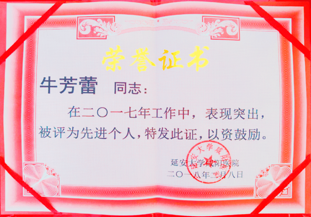 牛芳蕾,女,中共黨員,本科畢業于延安大學醫學院,取得學士學位,現在延安大學醫學院攻讀碩士學位。提起牛芳蕾醫生,熟悉她的同事和患者,都對她贊不絕口。她腳踏實地、堅韌不拔,孜孜不倦、刻苦鉆研,全身心投入婦科工作,待患者如親人,一切為患者著想,用平凡的事跡詮釋了一名婦科醫生心系群眾、愛崗敬業、全心全意為人民服務的天職。作為一名醫生,她深深懂得敬業精神至關重要。敬業就是要忠于職守、熱愛本職工作;要以病人為中心,全力為病人解除痛苦就是要對工作精益求精,對患者極端負責;要關愛病人,甘于奉獻。選擇了醫生這個職業,就選擇了神圣,選擇了偉大,選擇了高尚,選擇了奉獻。