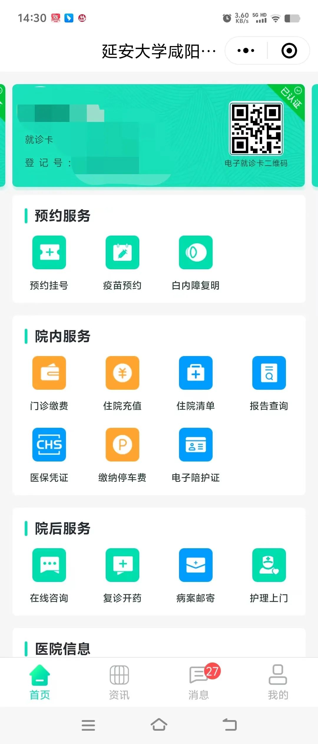 第1步:首先進入延安大學咸陽醫院互聯網醫院,點擊電子就診卡進行注冊綁卡實名認證。