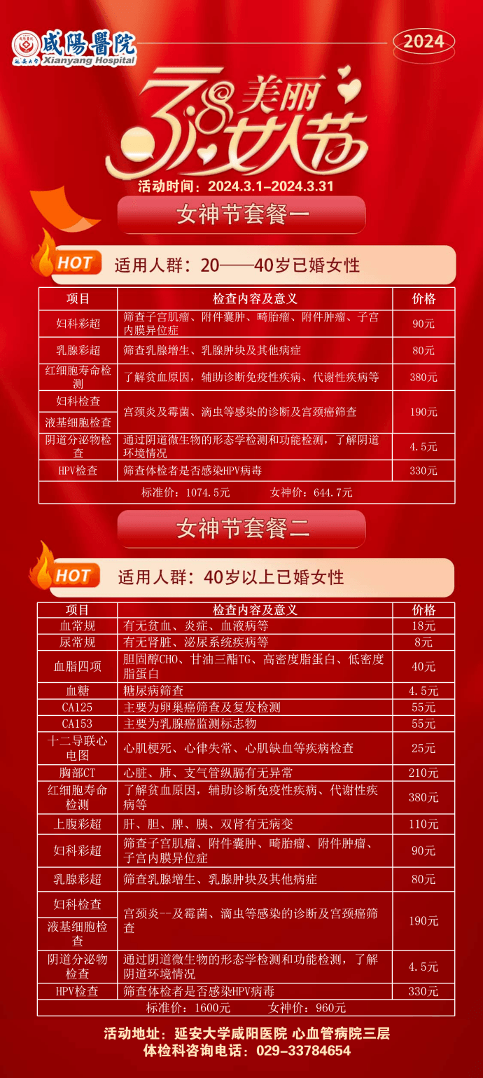 今年3.8收好健康錦囊,延安大學咸陽醫院體檢科特為廣大女性同胞準備了超值體檢優惠。