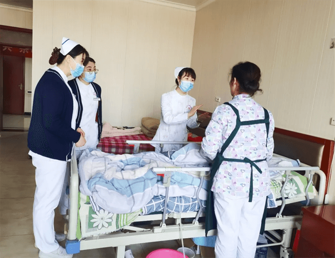 最后,康復醫學科劉敏護士長帶領專業組成員進入公寓內部,對部分失能老人進行護理查房,現場指導養老院的工作人員照護方式。劉敏護士長、徐莉護士長對一例股骨轉子間骨折長期臥床的老人進行了康復鍛煉、營養支持、并發癥預防方面的指導;劉文靜護士長、張雨護師對兩例帕金森患者的服藥、功能訓練等進行指導;趙小飛護士長、劉昱宏主管護師查看了一例壓力性損傷患者及一例失禁性皮炎患者,對傷口處理、失禁管理進行指導。