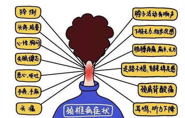 3、交感性頸椎病 主要病變為頸椎病變刺激頸椎周圍的交感神經末梢。高發年齡段為30-45歲,患者常有頭暈,頭痛、記憶力減退,注意力不易集中,耳鳴 耳堵、聽力下降、鼻塞、口干、聲帶疲勞等,惡心甚至嘔吐,腹瀉、消化不良、暖氣等、心悸、胸悶、心率變化。