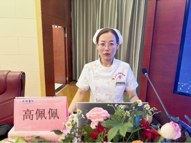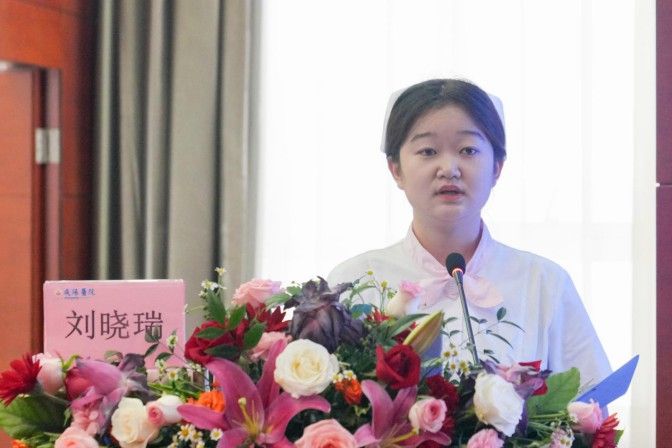 隨后,實習生代表劉曉瑞同學發言。她說:我們既是學習者,也是護理者,要時刻保持謙虛好學的態度,積極向上的心態,強化理論知識,磨練專業技能,用專業的知識和飽滿的熱情,尊重患者、關愛患者,努力踐行“以病人為中心”的服務理念。