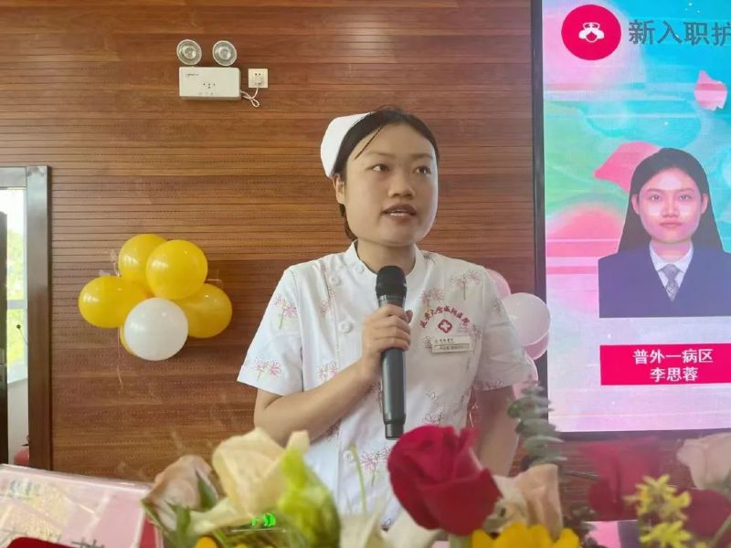 李思蓉代表新入職護士發言:作為新入職護理人員,要始終秉承南丁格爾精神,在學習上努力拓寬見識、在工作上不斷提升能力。希望通過本次規范化培訓理論課程的學習,不斷完善自我,善于學習,勤于思考,在工作中做到理論聯系實際,立志做一名有愛心、耐心和責任心,患者和家屬信任的護士。
