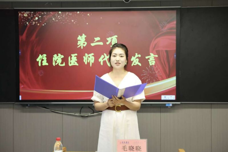 住培醫師代表毛曉曉在開班儀式上進行了代表發言,她十分感謝我院提供了此次培訓機會,表示在住培期間將以昂揚的斗志、飽滿的精神,嚴格遵守國家規培政策,履行醫院及各輪轉科室的各項要求,聽從住院醫師規范化培訓管理辦公室的管理;認真完成住院醫師規范化培訓的學習任務,努力掌握好理論知識及各項操作技能,完善跨學科診療思維,主動體現愛傷護傷的人文關懷理念,團結協作,挑戰自我,超越自我,為成為一名合格的臨床醫生打下堅實基礎。發言完畢后,毛曉曉帶領全體學員進行莊嚴宣誓,重溫醫學生誓言增強學員責任感、使命感,不忘投身醫學事業的初心,銘記“健康所系,性命相托”的誓言,用醫者仁心詮釋“大醫精誠”的深刻內涵。
