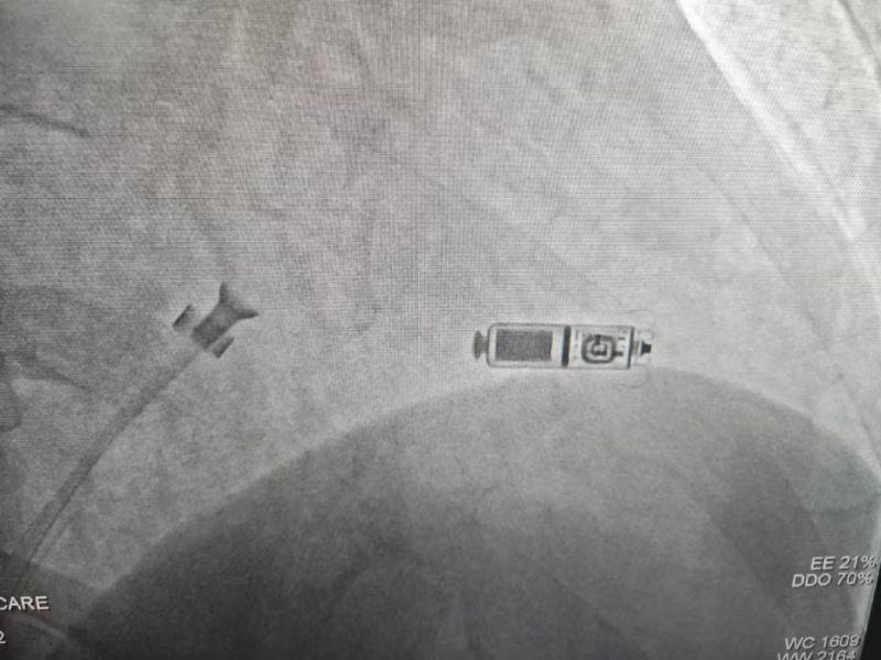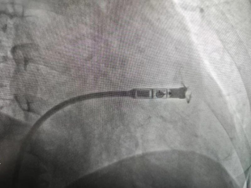 手術(shù)過程:經(jīng)過充分的術(shù)前討論,在延安大學(xué)咸陽醫(yī)院心血管病院吳棟梁院長(zhǎng)、劉雄濤副院長(zhǎng)的指導(dǎo)與支持下,李陽教授、何克強(qiáng)主治醫(yī)師、辛浩主治醫(yī)師與導(dǎo)管室介入團(tuán)隊(duì)的共同努力下,經(jīng)過超聲科、心電中心等多學(xué)科協(xié)作,成功為患者植入雙腔無導(dǎo)線永久起搏器,術(shù)后第二天患者在起搏器保障下經(jīng)藥物治療恢復(fù)正常的竇性心律。目前患者心臟情況及腦梗均恢復(fù)良好,已順利出院。