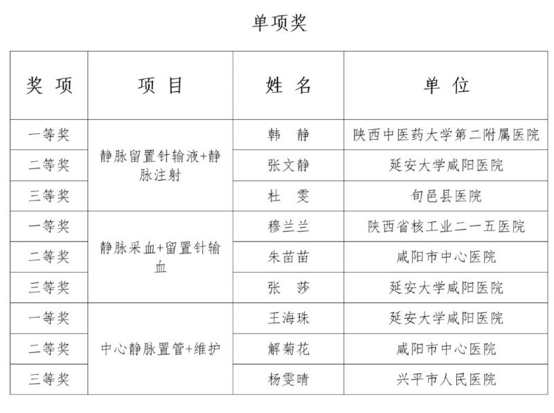 比賽結束后,陜西省護理學會靜脈治療專業(yè)委員會常務委員錢銳、委員陳靜、王娟娟分別對競賽過程中選手們的表現進行了點評。她們首先對各參賽者在比賽中展現出的精神面貌和專業(yè)態(tài)度給予了贊揚,肯定了選手們的專業(yè)能力。同時也指出各位選手在比賽中存在的不足并給出了中肯的建議。隨后,由咸陽市護理學會副秘書長何文靜宣布了比賽結果,本次競賽評選出團體一等獎1個、二等獎2個、三等獎3個,優(yōu)秀組織獎6個以及個人單項獎9個(獲獎名單附后)。