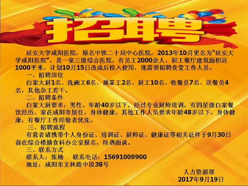 延安大學(xué)咸陽醫(yī)院職工餐廳員工招聘啟示