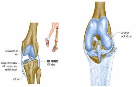 單純前交叉韌帶損傷可發生于非負重條件下膝強力過伸時(如用力踢時未遇到抵抗),或小腿固定、暴力使股骨向后時。單純前交叉韌帶損傷少見,多合并脛側副韌帶、半月板的損傷,此三結構的復合傷在膝部韌帶損傷中最為常見(占52%)。損傷多發生于韌帶中部(占 72%),少數發生于股骨附著點撕脫骨折 (18%)或脛骨附著點撕脫骨折(4%)。損傷后關節內出血、疼痛、活動受限、前抽屜試驗陽性。