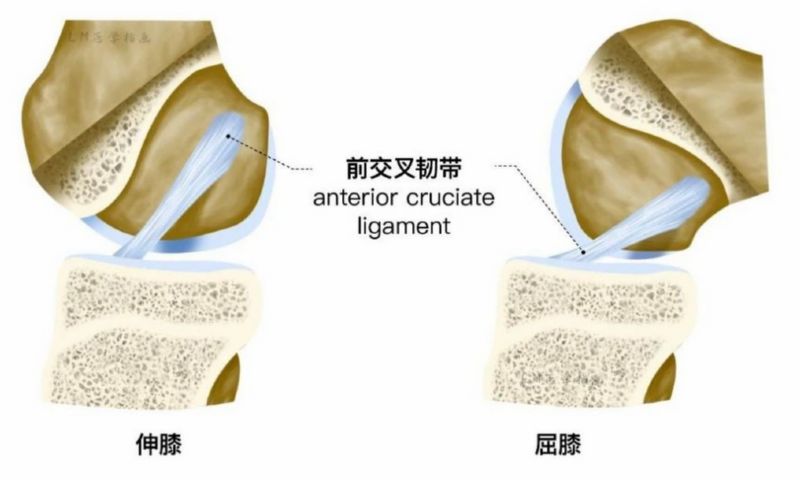 交叉韌帶 (Anterior cruciate ligament, ACL )起自脛骨髁間隆起的前方,斜向后外上方,止于股骨外側髁的內側面上部的一條韌帶。伸膝時最緊張,防止脛骨前移和膝過伸。當屈膝 30°~ 40°時,前交叉韌帶的張力最小。
