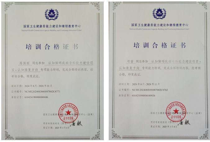在認(rèn)知障礙疾病診療領(lǐng)域不斷探索前行的征程中,我院又迎來一則振奮人心的喜訊!我院腦血管病院高強麗同志和鄧睿同志經(jīng)過不懈努力,成功取得國家衛(wèi)健委能力建設(shè)和繼續(xù)教育中心認(rèn)知障礙疾病專科能力建設(shè)項目-認(rèn)知康復(fù)方向?qū)m椖芰ε嘤?xùn)合格證書。這一成果的取得,不僅是兩位同志個人專業(yè)成長道路上的重要里程碑,更是我院在認(rèn)知障礙疾病診療體系建設(shè)進程中的又一有力見證。