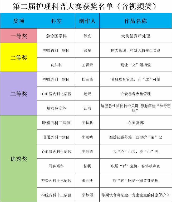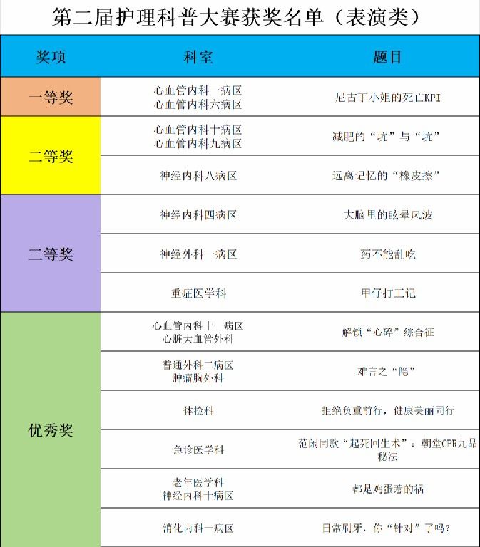 經(jīng)過評委從科普內(nèi)容、表現(xiàn)形式、科普效果等多個維度,對參賽作品進(jìn)行全面細(xì)致的評估,最終評選出表演類和音視頻類一等獎各1名、二等獎各2名、三等獎各3名、優(yōu)秀獎各6名,護(hù)理科普管理委員會主任委員、腦科病院宋春蘭總護(hù)士長宣讀比賽結(jié)果并組織了隆重的頒獎儀式。