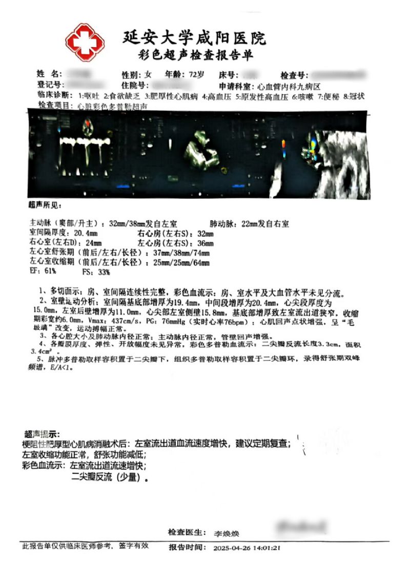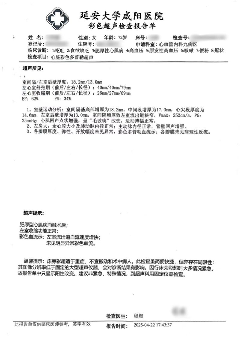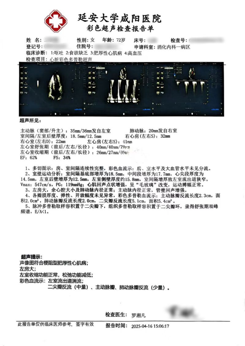 72歲的王女士(化名),早在7年前就被心臟彩超確診為室間隔肥厚并流出道梗阻。近期,她因“反復(fù)胸悶、氣短20余年,加重伴惡心、嘔吐1周”入住消化內(nèi)科。入院復(fù)查心臟彩超結(jié)果顯示:EF值為62%,F(xiàn)S值為34%;室間隔中上段厚度達(dá)到18.5/17.7毫米,左室流出道最大血流速度高達(dá)547cm/s,PG值為119mmHg,明確診斷為梗阻型肥厚型心肌病。同時,腦鈉肽檢測值為3050.6ng/l。綜合評估后,王女士轉(zhuǎn)入心血管內(nèi)科九病區(qū)接受進(jìn)一步治療。