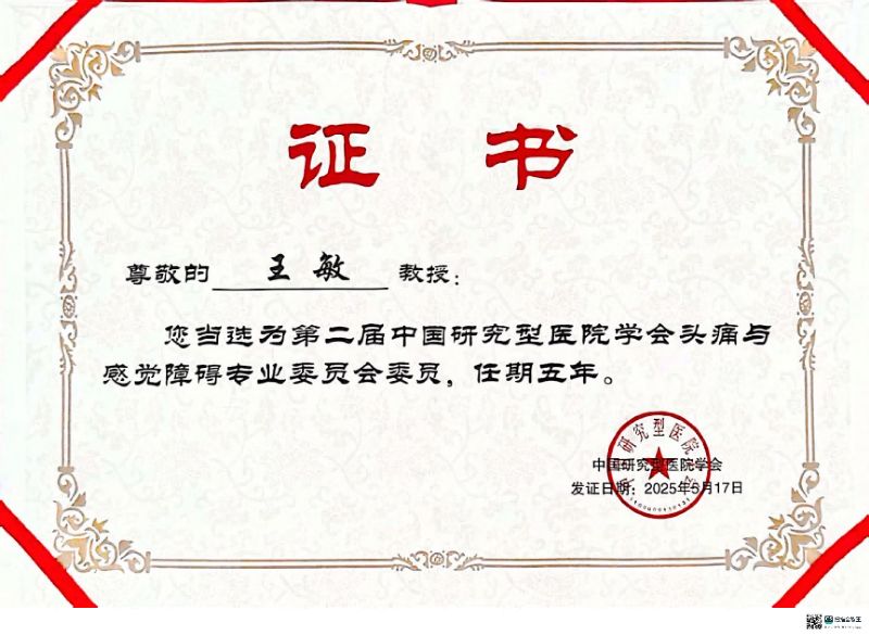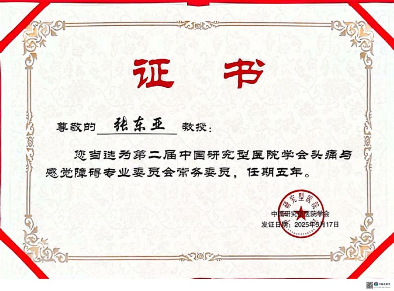 在近期召開的“2025中國頭痛大會”上,我院張東亞主任當選為中國研究型醫院學會頭痛與感覺障礙專業委員會常委,王敏主任當選為委員。兩位專家的任職標志著本院在頭痛領域的研究與臨床實踐獲得國家級認可。