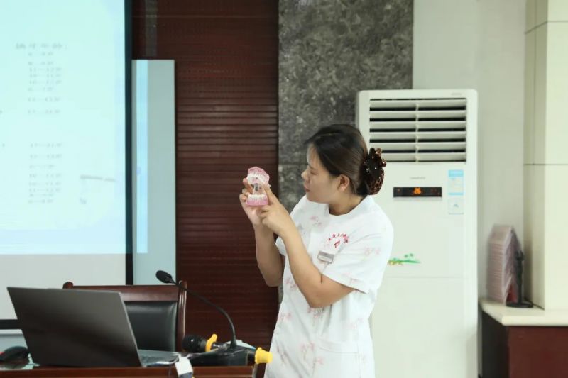 口腔病院周寧寧護士通過生動有趣的PPT和實物模型,為孩子們講解了牙齒結(jié)構(gòu)、齲齒形成的原因,教會孩子們正確刷牙方法及日常飲食中護齒知識。孩子們聽得津津有味,紛紛舉手參與互動。
