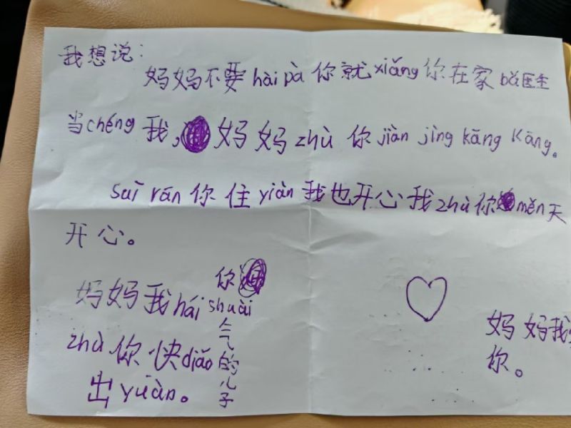 瑤瑤:“工作中我一直勤勤懇懇,認真負責,對待每位患者都熱情周到服務,用真誠與熱情溫暖著每一位患者的心。面對行動不便的患者,會主動上前攙扶,遇到情緒焦慮的患者,會停下手中的工作,用專業(yè)知識和溫暖話語安撫化解患者的不安。經(jīng)常受到領導與家屬的好評。生活中由于工作原因沒有太多時間陪我兒子,但是我會讓兒子感到不管我在哪里都很愛他,我會經(jīng)常對他說媽媽愛你,出門的時候會抱抱他,他現(xiàn)在已經(jīng)7歲了,我還是會這樣做。小的時候只要有時間我都會給他講繪本故事,每次不管多累都會陪他干他想干的事,下夜班回家他都不會打擾我,真的是個很暖、很省心的孩子。還有就是家里人的支持,一個有愛的家庭氛圍也是很重要的。這次生病后讓我收獲家人滿滿的愛。”這時她拿出手機讓我看孩子給她寫的信,讀著讀著瑤瑤突然趴到我的肩膀失聲痛哭起來。