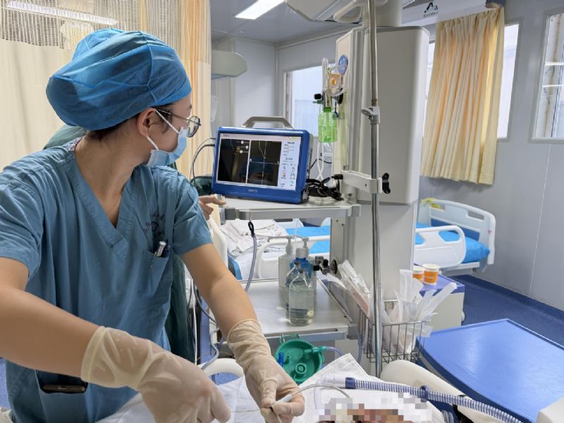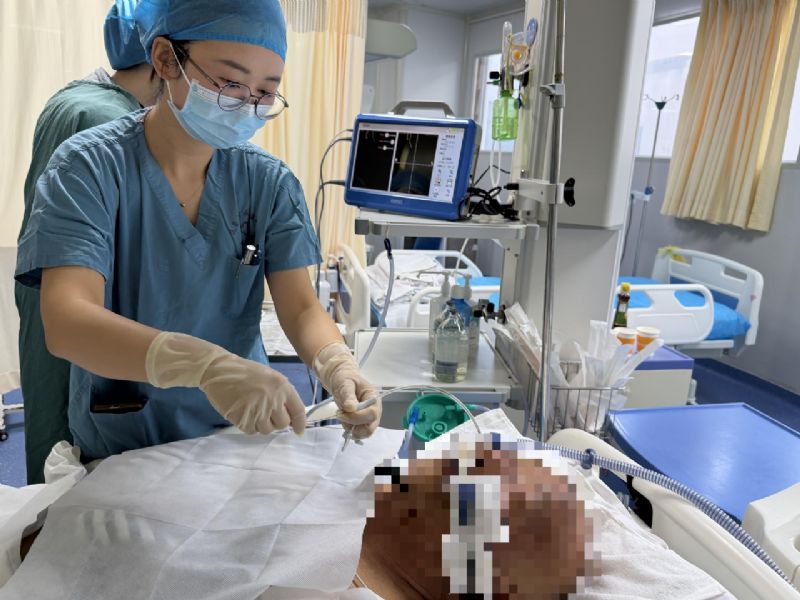患者為男性,因車禍致重型閉合性顱腦損傷、全身多處損傷,并繼發肺部感染,被緊急收治于我院重癥醫學科。患者病情危重,合并嚴重意識障礙、吞咽功能障礙,誤吸風險評分達5分;經NRS2002營養風險篩查評分為4分,存在明確營養風險。為保障救治效果,科室團隊精準研判,決定為患者留置鼻空腸管開展腸內營養支持。傳統盲插鼻腸管技術高度依賴醫護人員操作經驗,術中常出現導管胃內盤繞、位置調整耗時久、需反復借助X線確認管端位置等問題,不僅易延誤早期腸內營養啟動時機,更會增加患者的痛苦與臨床風險。
