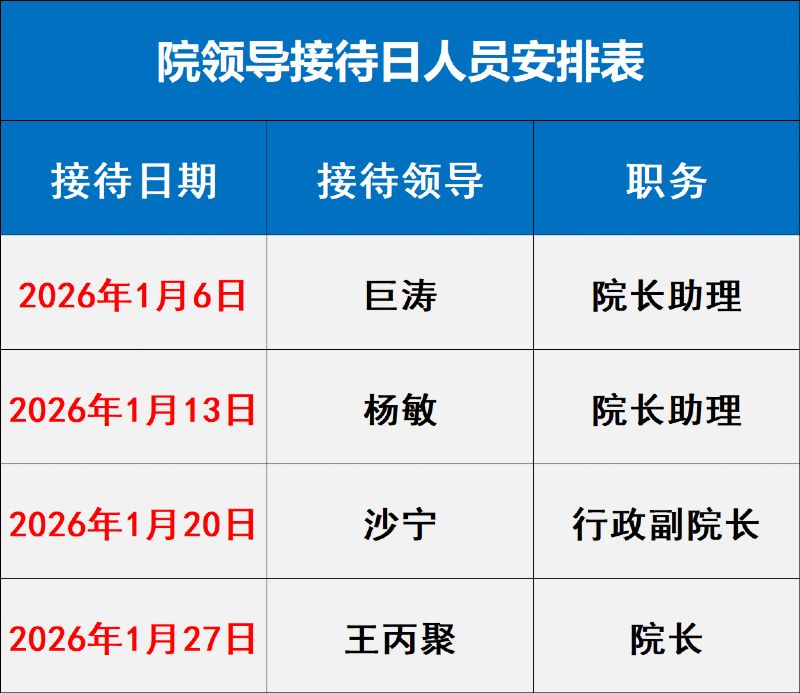 為進一步提升醫療質量、醫療安全和服務效率,不斷改善群眾看病就醫體驗,我院特設立 “院領導接待日”,院領導面對面接待群眾來訪,現場答疑解惑,切實落實 “醫院領導要把職工的利益放在第一位,全院職工要把患者的需求放在第一位” 的核心要求,現將2026年1月醫院“院領導接待日”安排公示如下: